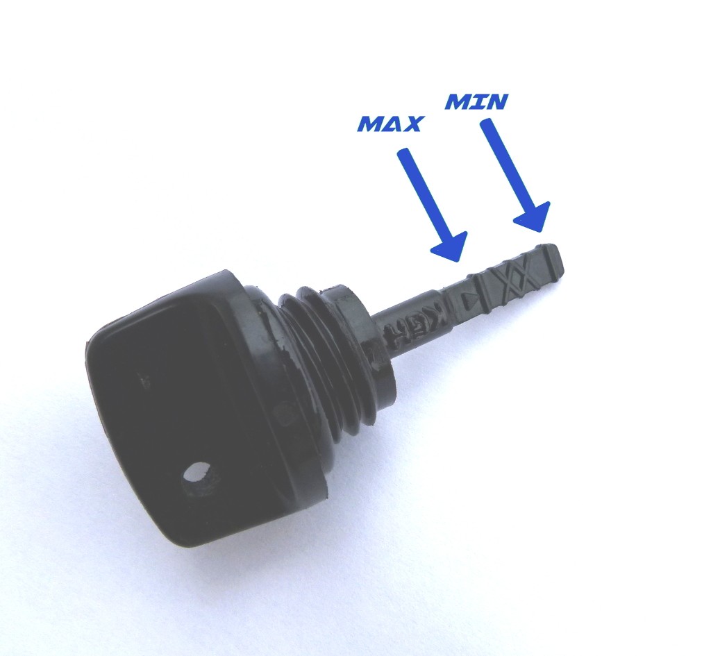 Si vous n’avez pas de bol (ou une CBR, qu’elle soit 125 ou 1000), le niveau se fera grâce à une jauge. Comme sur les voitures. Cette jauge est située au même endroit que les hublots. Attention, il ne faut pas confondre l’orifice de remplissage, situé en haut du carter, et la jauge, en bas. Un moyen simple de vérifier que vous avez dévissé le bon truc : si c’est juste un bouchon, ce n’est pas la jauge. La jauge est un bouchon, mais avec une tige graduée. Comme pour le hublot, il y a un minimum et un maximum. Essuyez la tige avec un chiffon, et reposez la jauge sur son pas de vis. Attention, il ne faut pas la visser ! Une fois posée, vous pouvez la reprendre et vérifier qu’il y a de l’huile entre les deux graduations.