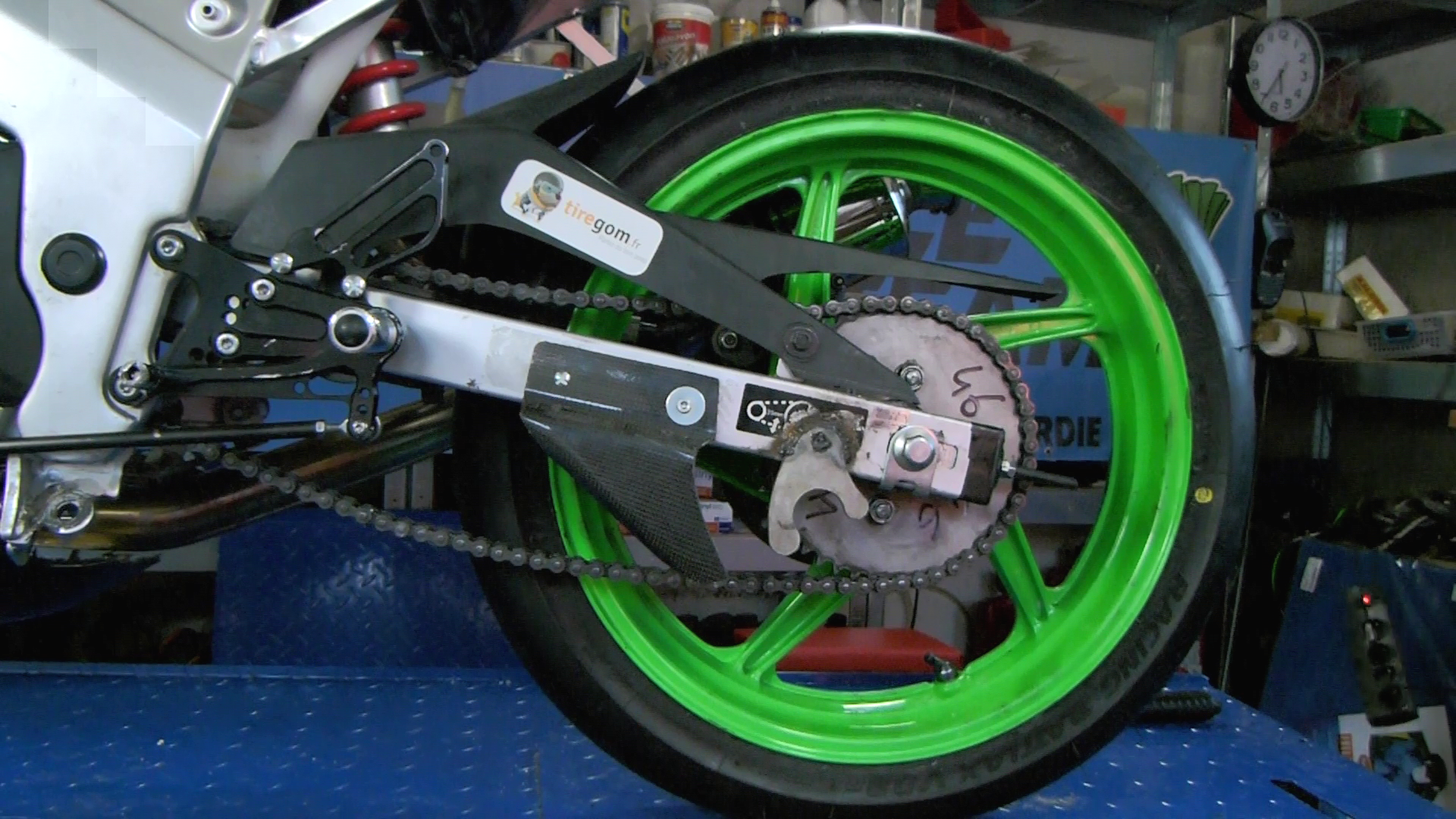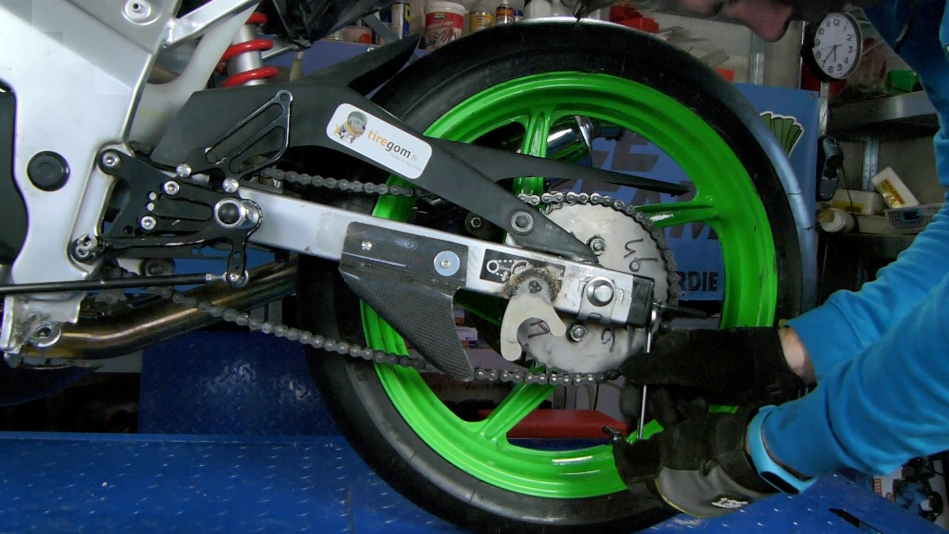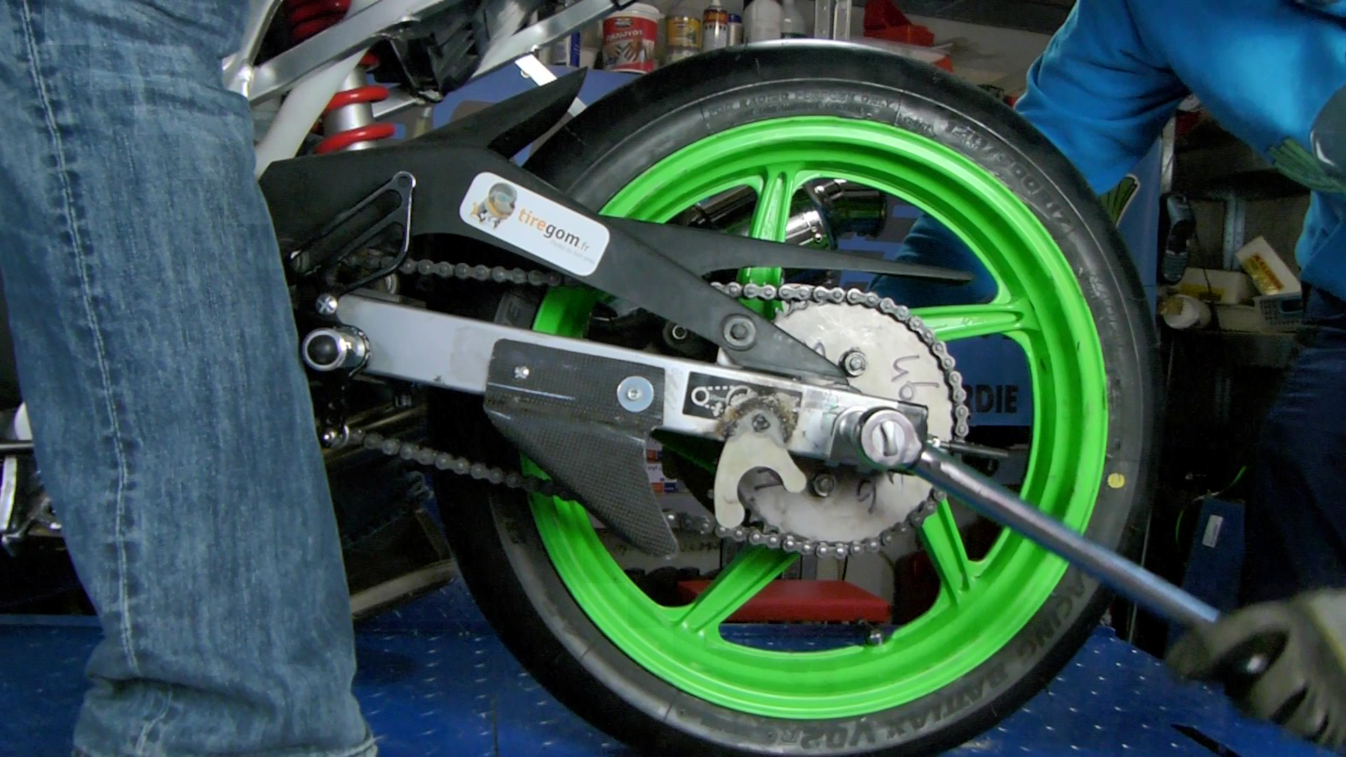 Par contre, petit point important : la tension de chaine se fait avec les deux roues posées par terre et idéalement avec le pilote sur la machine. Car même si le conducteur ou la conductrice est léger(e) comme un jockey, cela influe sur la tension de chaine, car cela change la géométrie de la moto.